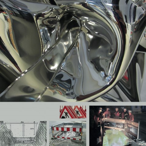 Die Künstlerin sagt dazu: "Eine zwei Meter tiefe Baugrube mitten auf dem Bürgersteig ist inklusive der Erdleitungen und Kanalrohre bis zu den Gehwegsplatten vollkommen mit einer hochglänzenden Silberchromschicht ausgekleidet. Statt auf feuchte braune Erde blickt man in einen von der Straßenlaterne bestrahlten Spiegel, der seine Umwelt verzerrt zurückstrahlt. Jede Stadt hat auf physischen und auch auf anderen Ebenen Wunden und Löcher, die im täglichen Leben spürbar sind, aber seltsam unausgesprochen und unbearbeitet bleiben. Einer der Impulse für die Eingriffe von Shining void ist, diese Form der Abwesenheit durch die Schaffung einer besonderen Leerstelle zum Thema zu machen. Shining void ist ein versteckter Glanzpunkt im Außenraum, der die „Verletzung“ konserviert und veredelt. Die Aushöhlung wird zu etwas Fremden mit futuristisch anmutender Oberfläche, das Einzug in den Stadtraum gehalten hat. „Es“ frisst sich in den Stadtkörper und befragt den soliden Grund: Ein Ort entsteht."